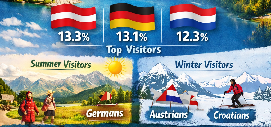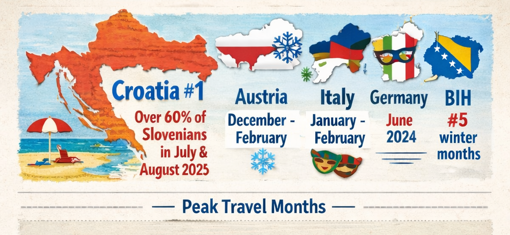 Where do Slovenians like to travel, and when do they go? Experimental data from the Statistical Office of the Republic of Slovenia, based on mobile users roaming in foreign networks, provides clear answers. Top Destinations There are no surprises at the top. Croatia remains the number one destination for Slovenians.